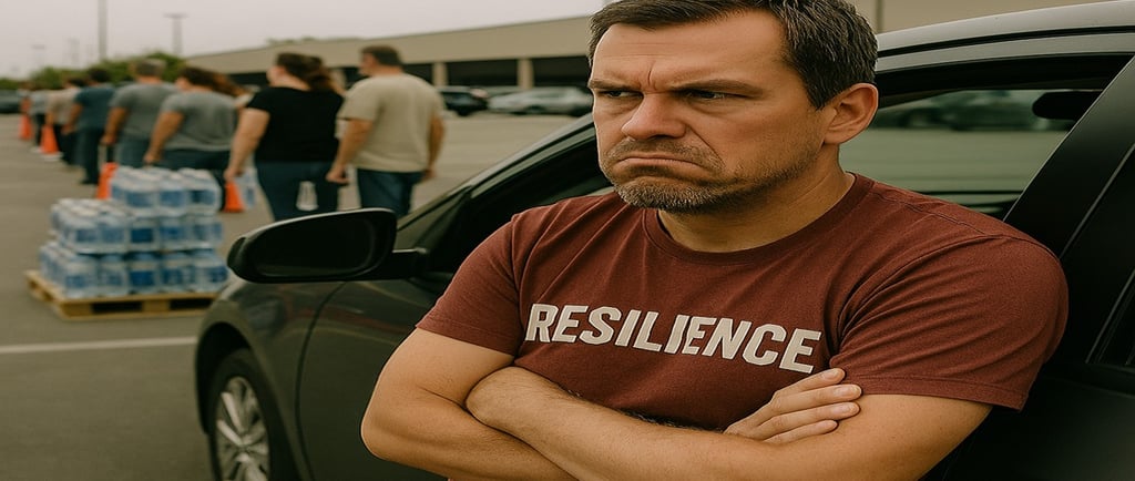 The joy of queuing in car parks for water where local characters and unemployed actors have audiences to entertain. This is unbearable. No one thinks you’re funny. Why do people take more than they need? Are you going to return the shopping trolleys you are using to transport your water home?